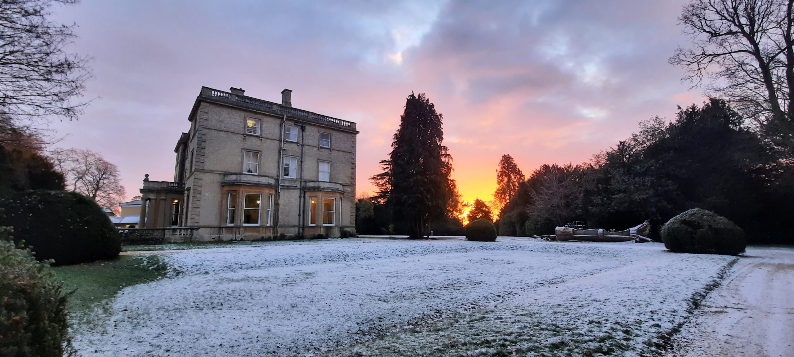 It’s a quiet January morning as the sun rises, casting fiery colours across the horizon. Swanbourne House catches the golden light, highlighting its familiar shape against the winter sky.